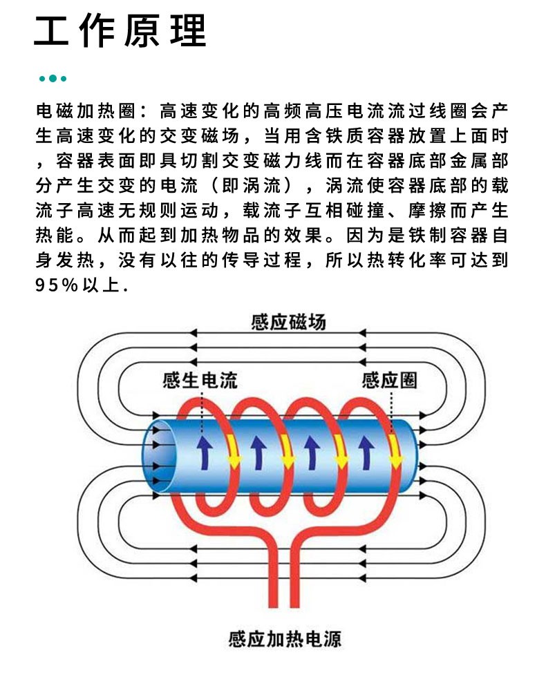 產(chǎn)品簡介:25KW電磁加熱器磁加熱系統(tǒng)由兩部分組成:電磁控制器和加熱圈。原機受溫度控制的電源(加熱輸出接觸器(或固態(tài)繼電器)輸出端)經(jīng)電磁控制器將工頻交流電整流、濾波、逆變成20—50KHZ的高頻高壓電,通過連接線接到電磁加熱圈上,高頻交流電透過保溫材料作用于料筒,使料筒本身發(fā)熱。另外,也可以把電源直接輸入到電磁控制器,原有的溫度控制器直接用來控制電磁控制器。