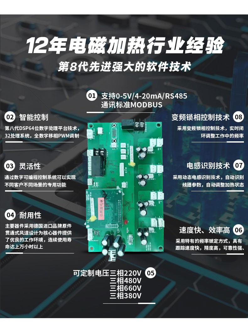 產(chǎn)品簡(jiǎn)介: 80Kw電磁感應(yīng)加熱柜由兩部分組成:電磁加熱控制板和電磁加熱線圈。原機(jī)受溫度控制的電源[加熱輸出接觸器(或固態(tài)繼電器)輸出端]經(jīng)電磁加熱控制板將工頻交流電整流、濾波、逆變成18~30KHz的高頻交流電,通過連接線接到電磁加熱圈上,高頻交流電透過保溫材料作用于料筒,使料筒本身發(fā)熱。另外,也可以把電源直接輸入到電磁加熱控制板,原有的溫度控制器直接用來控制電磁加熱控制板。